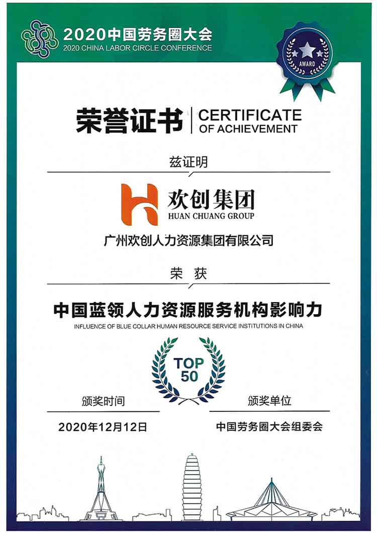 欢创集团荣获中国蓝领人力资源服务机构影响力TOP50证书